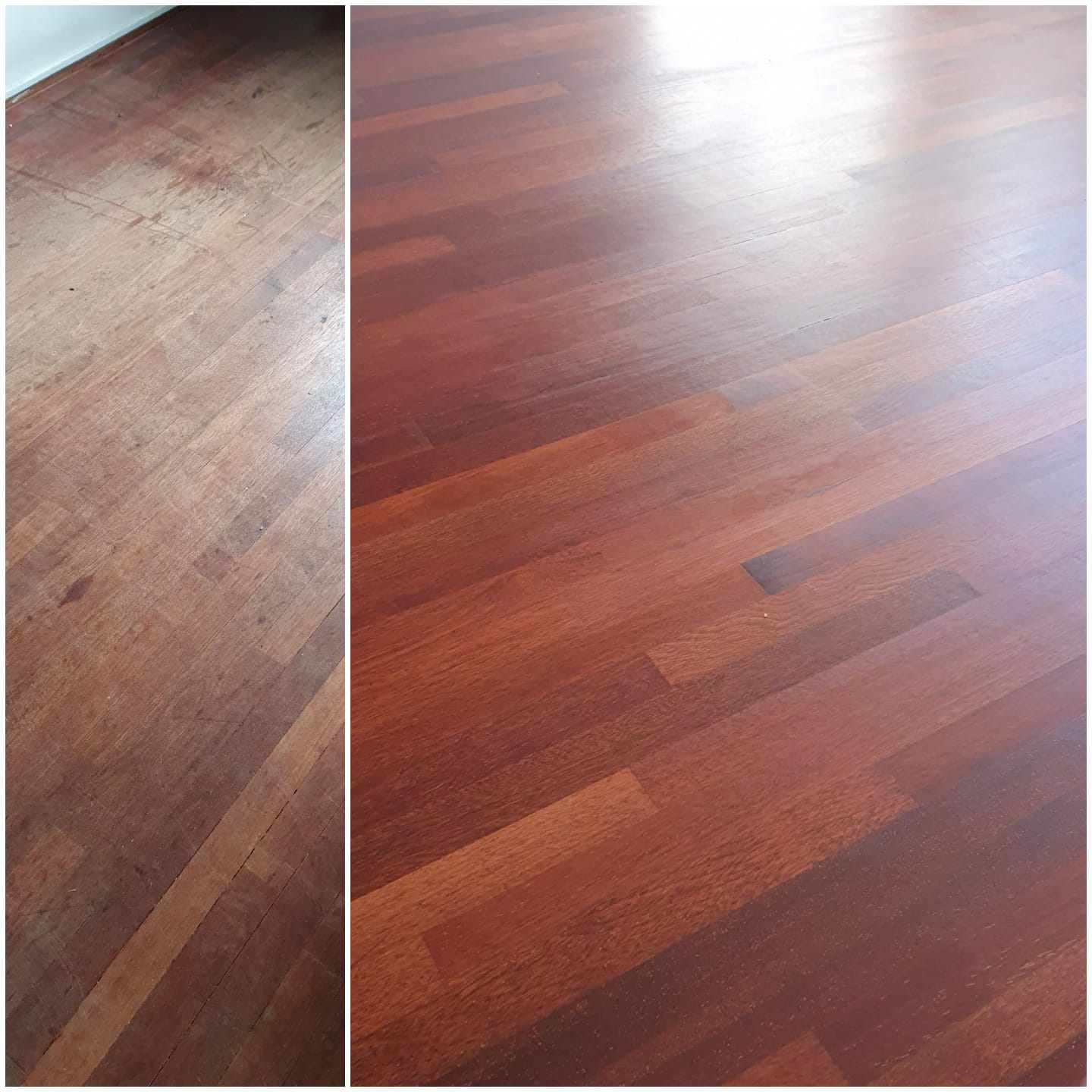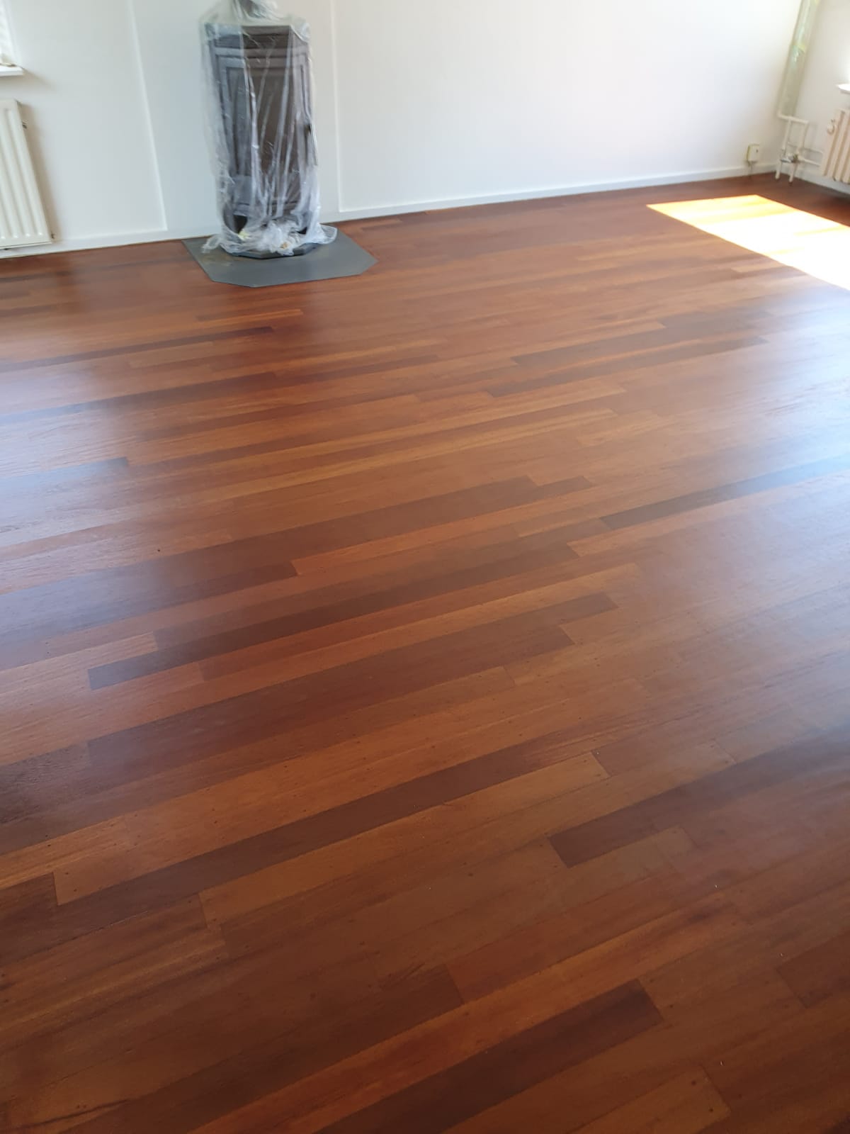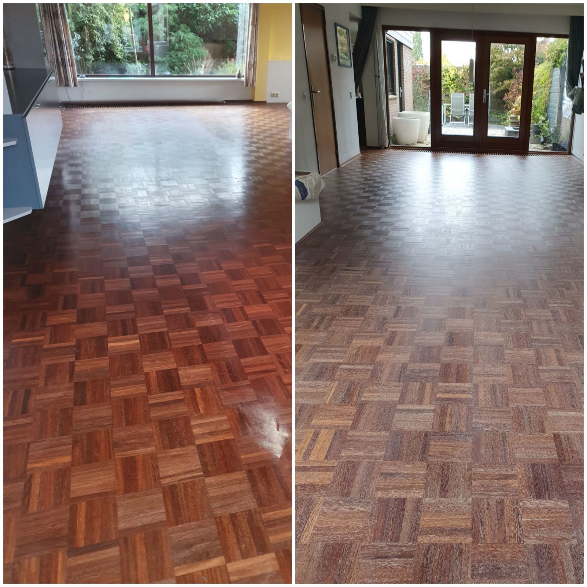 Panga Panga vloer. Voor tijdens en na. Afgewerkt met Lak