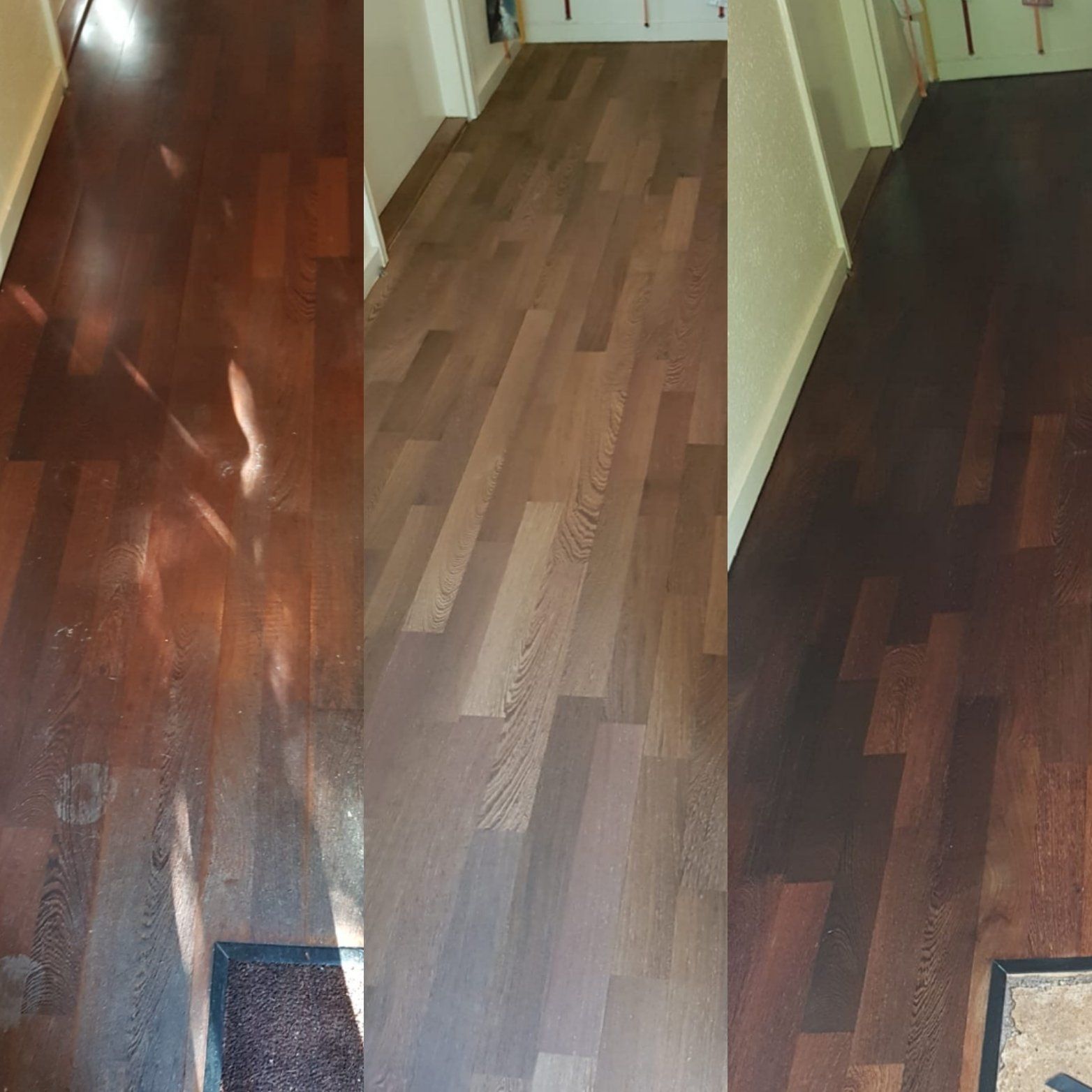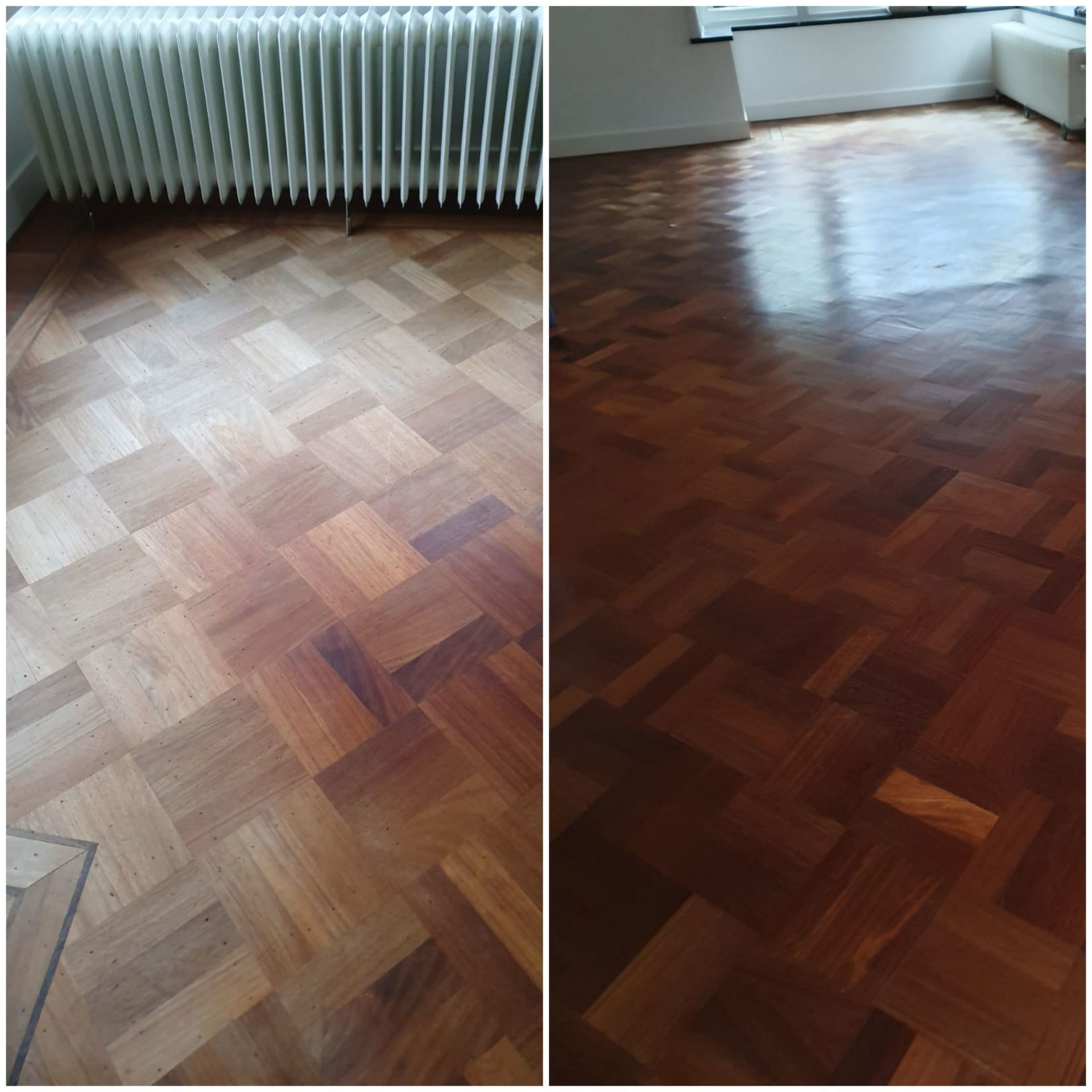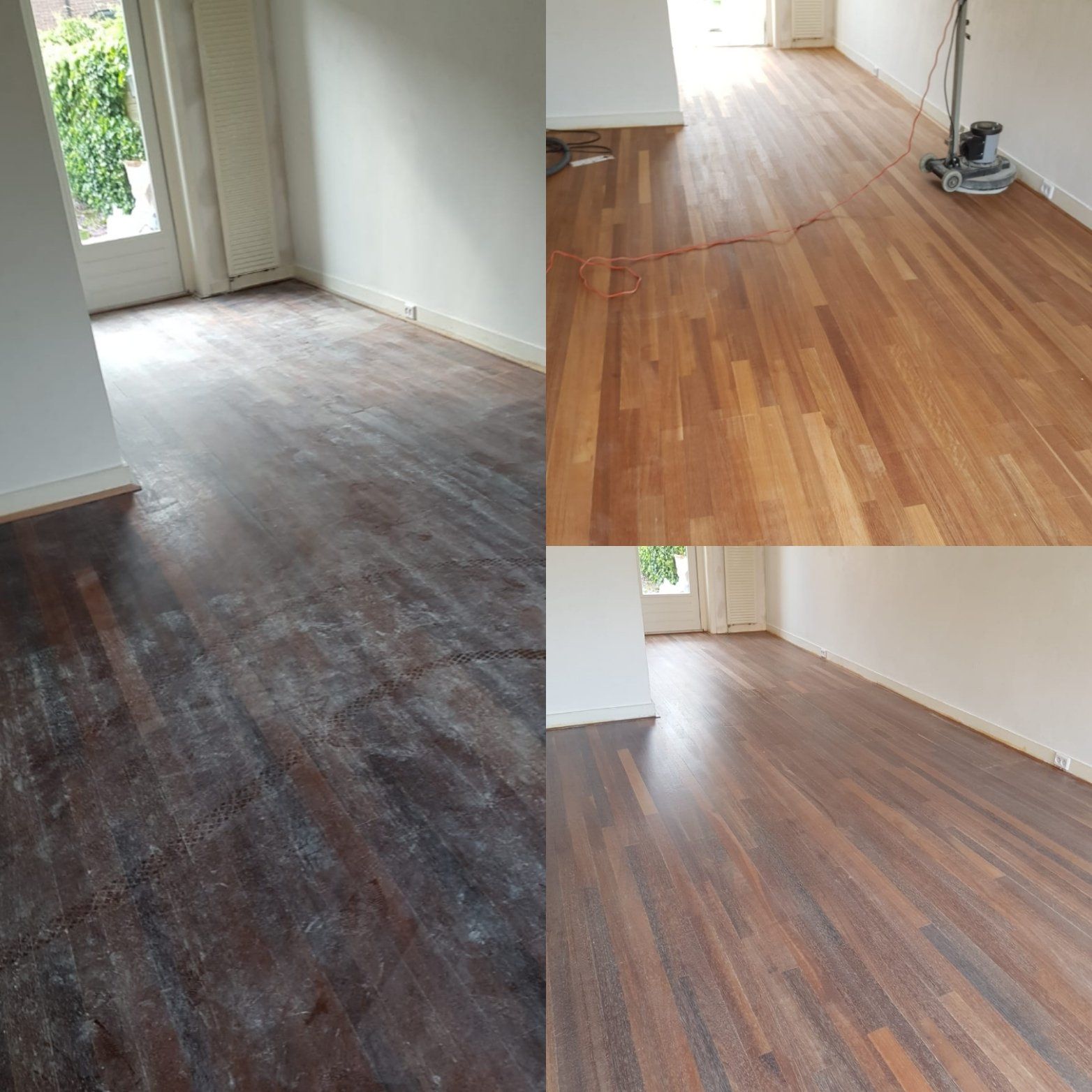 Panga Panga vloer. Voor tijdens en na. Afgewerkt met Lak