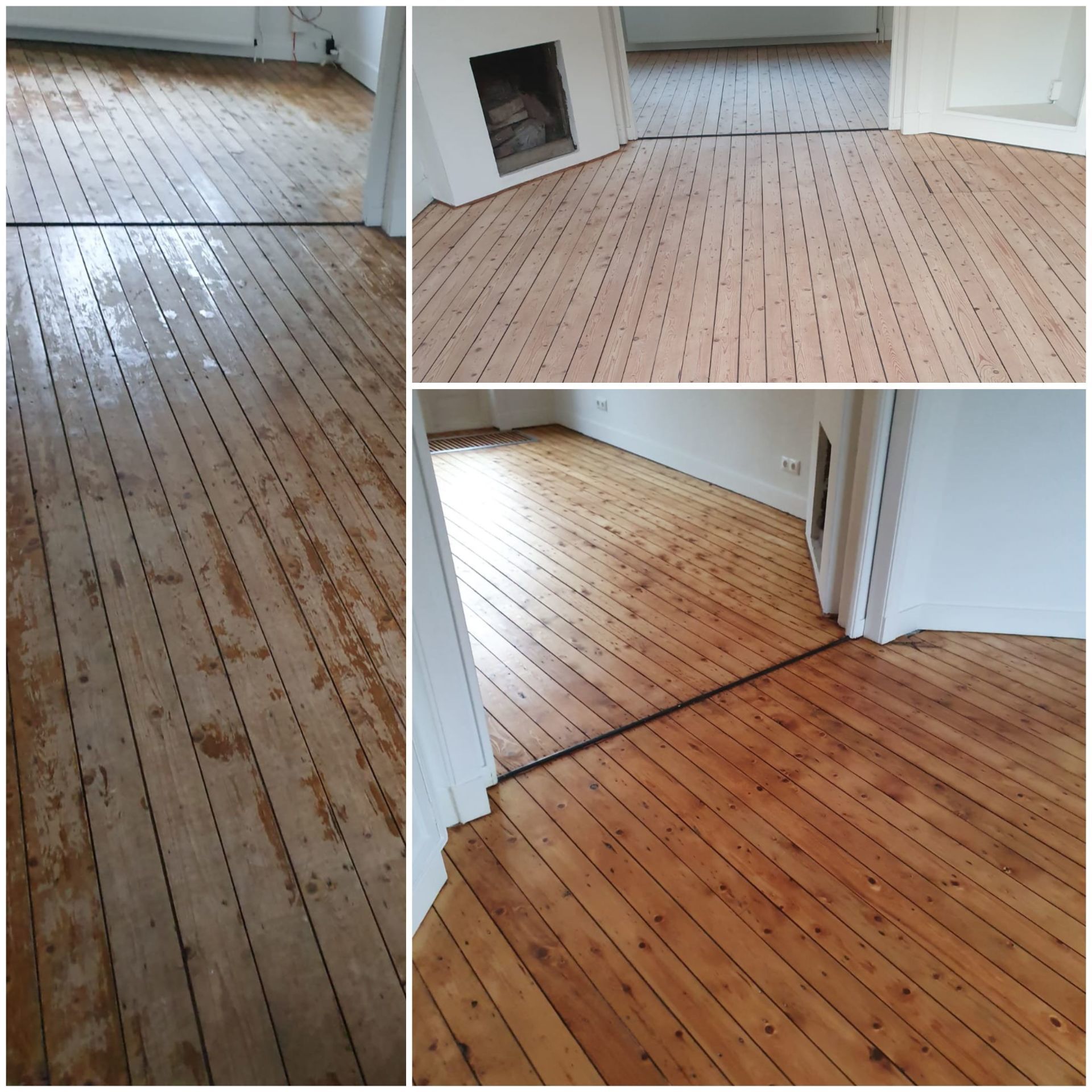 Grenen werkvloer opgeschuurd en in de pure olie gezet.