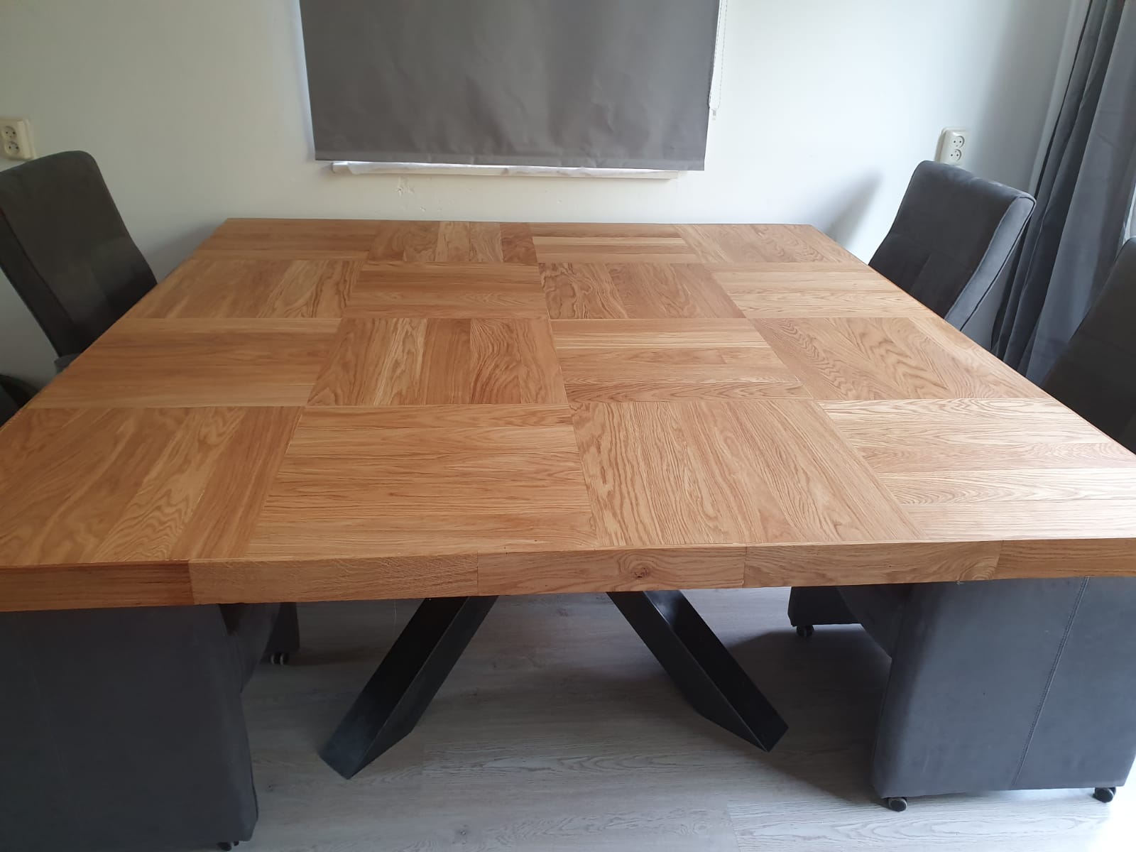 Tafel met een massief eiken blokpatroon. Afgewerkt met pure olie. Onderstel stalen matrixpoot.